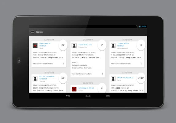 - Large database with the most common films/developers combinations! - You can create, modify and delete your personal combinations! - You can SHARE your combinations with the users of Dev it and you can use combinations created by other users! - You can rate your favorite combinations! - Fully configurable timer. - Time/temperature variations. - You can create custom agitation schemas.