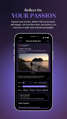 Reflect on Your Journey: Capture the essence of your experiences by adding images, rating your flow state, sharing your feelings, and answering reflection prompts. Keep everything organized with dedicated passion folders.