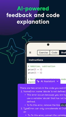 • AI-assisted learning: Explore, learn, and code in Python or SQL with help from AI. Designed to accelerate independent learning, fix bugs faster, and give instant, custom explanations so you stay in flow.