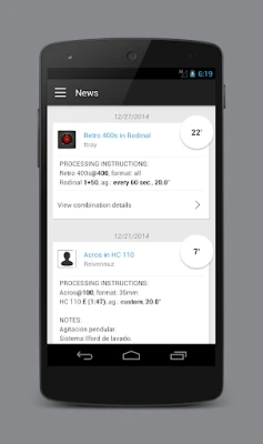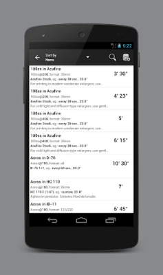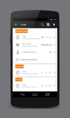 - Large database with the most common films/developers combinations! - You can create, modify and delete your personal combinations! - You can SHARE your combinations with the users of Dev it and you can use combinations created by other users! - You can rate your favorite combinations! - Fully configurable timer. - Time/temperature variations. - You can create custom agitation schemas.