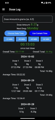 See your average intake per day, your average time between doses, and your overall average intake and time between doses.
