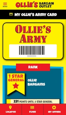 • Your Ollie’s Army Card and Offers are all here, just waiting to be scanned right from your phone! You can even view your Rank and Points or update your Profile information!