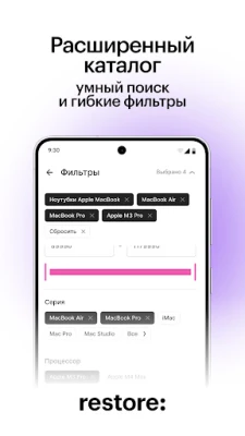 Совершать покупки устройств и аксессуаров в приложении можно из любой точки страны. Техника и электроника доступна для заказа в любое время, больше не нужно тратить время на поездку в магазин электроники. Чтобы оценить все преимущества, достаточно сделать первый шаг - скачать приложение restore: